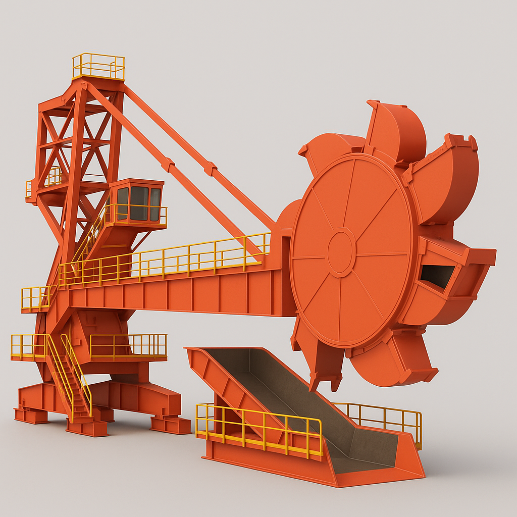Bulk material scraped by bucket wheel enters discharge chutes: